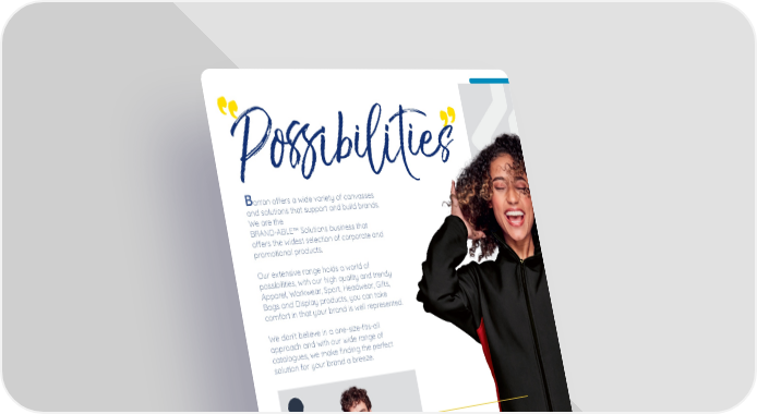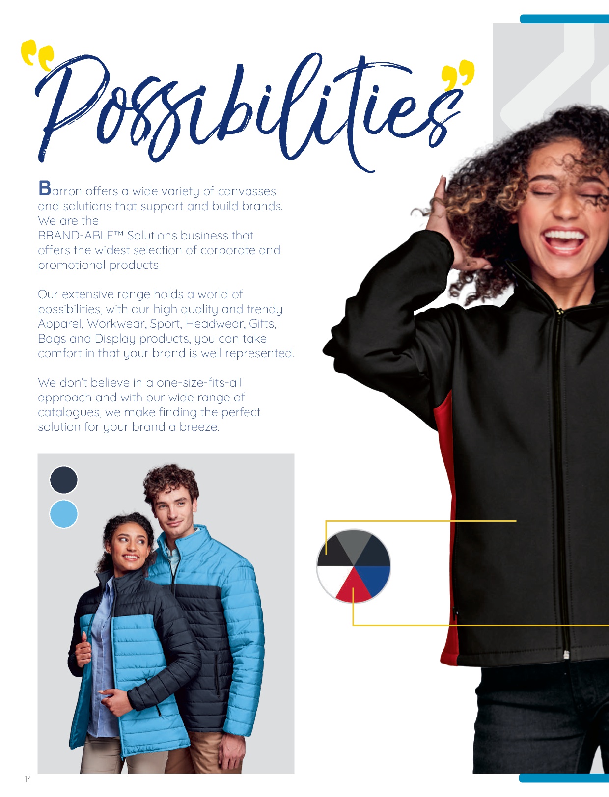 Po猀猀ibilities Barron o昀昀ers a wide variety of canvasses ” and solutions that support and build brands. ” We are the BRAND-ABLE™ Solutions business that o昀昀ers the widest selection of corporate and promotional products. Our extensive range holds a world of possibilities, with our high quality and trendy Apparel, Workwear, Sport, Headwear, Gifts, Bags and Display products, you can take comfort in that your brand is well represented. We don’t believe in a one-size-昀椀ts-all approach and with our wide range of catalogues, we make 昀椀nding the perfect solution for your brand a breeze. 14