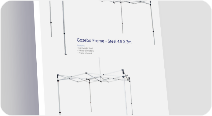 2024 Display catalogue Page 41 Page 43Gazebo Frame - Steel 4.5 X 3m Features: • Lightweight Steel • Plastic connectors • Frame is boxed Gazebo Frame - Steel 3 x 3m Features: • Lightweight Steel • Plastic connectors • Frame is boxed 40