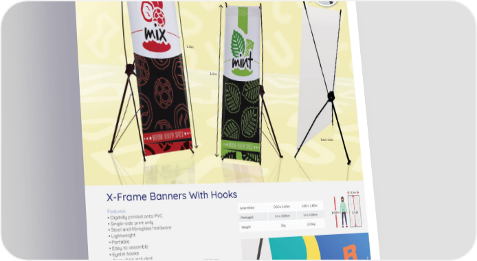 Hook back view detail 80cm Hook front view detail 60cm 1.8m 1.6m Back view X-Frame Banners With Hooks .85m Features: Assembled 0.60 x 1.60m 0.80 x 1.80m • Digitally printed onto PVC • Single-side print only Packaged 14 x 108cm 14 x 118cm 1.68m 1.8m • Steel and 昀椀breglass hardware Weight 2kg 2.25kg • Lightweight • Portable • Easy to assemble • Eyelet hooks • Carry bag included • Cost-e昀昀ective solution for promotions and exhibitions Print type: Fabric type: PVC SUBLIMATE HOW TO STEP 1 ORDER Select frame size: • See size indications 15