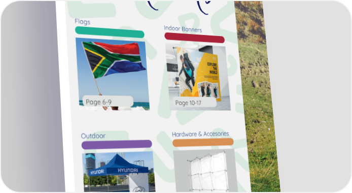 2024 Display catalogue Page 5 Page 7Contents Flags Indoor Banners Page 6-9 Page 10-17 Outdoor Hardware & Accesories Page 18-37 Page 38-41 5