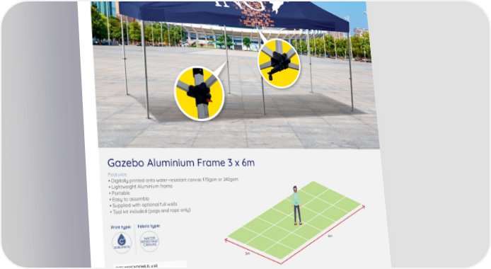 Gazebo Aluminium Frame 3 x 6m Features: • Digitally printed onto water-resistant canvas 170gsm or 240gsm • Lightweight Aluminium frame • Portable • Easy to assemble • Supplied with optional full walls • Tool kit included (pegs and rope only) Print type: Fabric type: WATER RESISTANT SUBLIMATE CANVAS 6m 3m SIZE INDICATIONS (L x H) Assembled 3.00 x 6.00m Packaged 160 x 44 x 26cm Weight 20kg HOW TO STEP 1 STEP 2 STEP 3 ORDER Select frame type: Select fabric Select options • Steel • 170gsm • Half wall • Aluminium • 240gsm • Full wall Gazebo toolkit 20