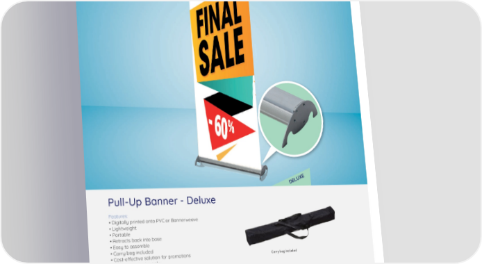 XE U DEL Pull-Up Banner - Deluxe Features: • Digitally printed onto PVC or Bannerweave • Lightweight • Portable • Retracts back into base • Easy to assemble • Carry bag included • Cost-e昀昀ective solution for promotions Carry bag included • Single-sided print only Print type: Fabric type: .85m BANNER PVC SUBLIMATE WEAVE Assembled 0.85 x 2m 2m Base Deluxe HOW TO STEP 1 Packaged 85 x 10 x 10cm ORDER Select frame type: • Econo Weight 5kg • Deluxe 13