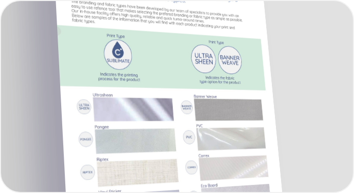 Printing & Fabric Give your brand a unique and high value appearance through a wide variety of branding and fabric types. The branding and fabric types have been developed by our team of specialists to provide you with an easy to use refence tool that makes selecting the prefered branding or fabric type as simple as possible. Our in-house facility o昀昀ers high quality, reliable and quick turna-around times. Below are samples of the information that you will 昀椀nd with each product indicating your print and fabric types. Print Type Print Type ULTRA BANNER SUBLIMATE SHEEN WEAVE Indicates the printing Indicates the fabric process for the product type option for the product Ultrasheen Banner Weave ULTRA BANNER SHEEN WEAVE Pongee PVC PONGEE PVC Riptex Correx RIPTEX CORREX Vinyl Sticker Eco Board VINYL ECO STICKER BOARD Water Resistant Canvas Bunting WATER RESISTANT BUNTING CANVAS 4