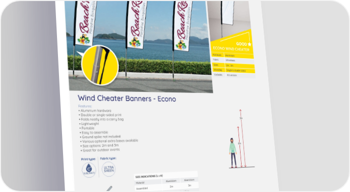 ECONO WIND CHEATER Hardware Aluminium Fabric Ultrasheen Sizes 2m ; 3m Branding Single & double-sided Excludes 4m version Wind Cheater Banners - Econo Features: • Aluminium hardware • Double or single-sided print • Folds neatly into a carry bag 3m • Lightweight • Portable • Easy to assemble • Ground spike not included • Various optional extra bases available • Size options: 2m and 3m 2m • Great for outdoor events Print type: Fabric type: ULTRA SUBLIMATE SHEEN SIZE INDICATIONS (L x H) Material Aluminium Aluminium Assembled 2m 3m Packaged 170 x 10 x 10cm Weight (Single-Sided) 1.6kg 1.7kg Weight (Double-Sided) 2kg 2.2kg Ground spike HOW TO STEP 1 STEP 2 STEP 3 STEP 4 ORDER Select frame material: Select frame size: Select print options: Select print type: • Aluminium • See size indications • Single-sided • Digital print • Double-sided 30
